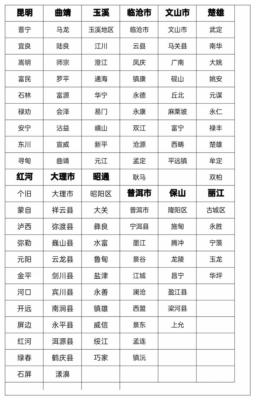 曲靖:马龙 陆良 师宗 罗平 富源 会泽 沾益 宣威 曲靖
