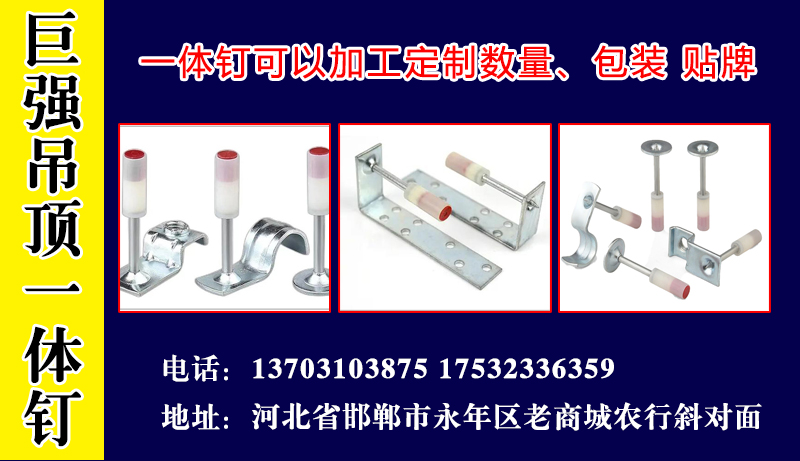 巨强一体钉 主营产品:吊顶一体钉、管卡钉、迷你钉、消防钉、吊顶神器 专供市场调货 一体钉可以加工定制数量、包装 贴牌 电话:13703103875 17532336359 地址:河北省邯郸市永年区老商城农行斜对面