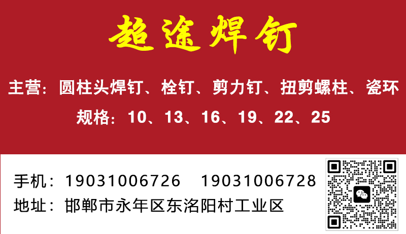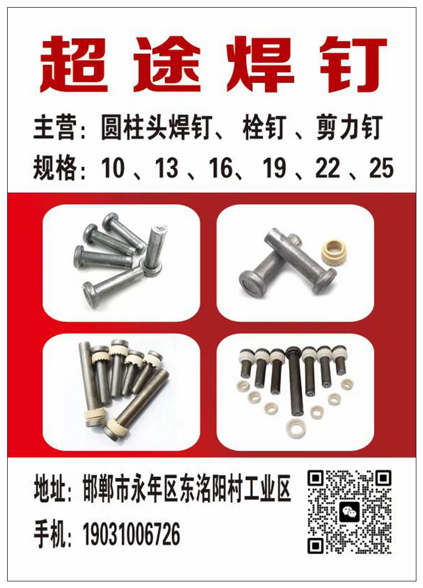 超途焊钉 主营:钢结构圆柱头焊钉、栓钉、剪力钉、扭剪螺柱、瓷环 规格:10、13、16、19、22、25 手机:19031006726 19031006728 地址:邯郸市永年区东洺阳村工业区