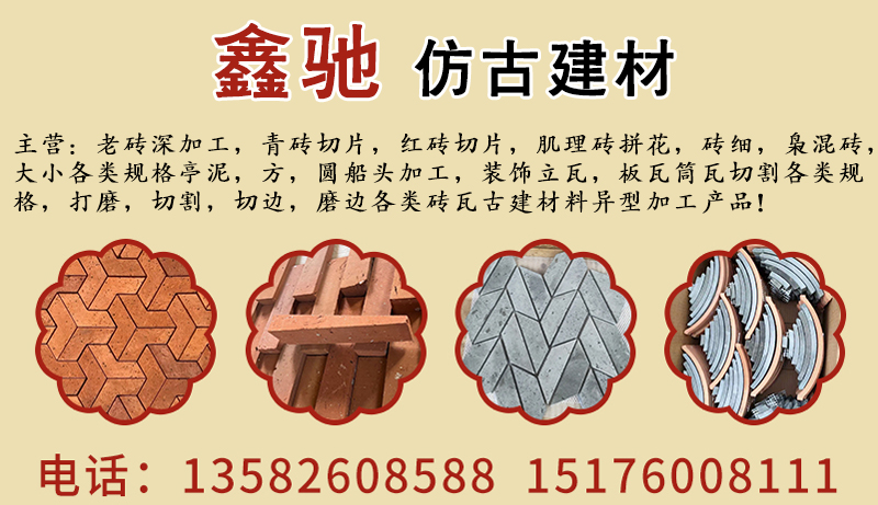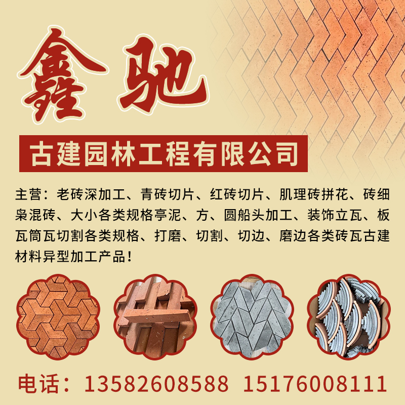 鑫驰仿古建材 主营:老砖深加工,青砖切片,红砖切片,肌理砖拼花,砖细,枭混砖,大小各类规格亭泥,方,圆船头加工,装饰立瓦,板瓦筒瓦切割各类规格,打磨,切割,切边,磨边各类砖瓦古建材料异型加工产品!