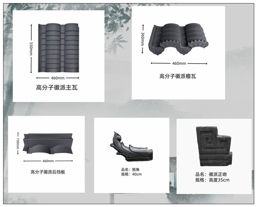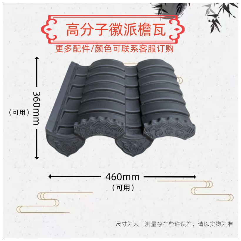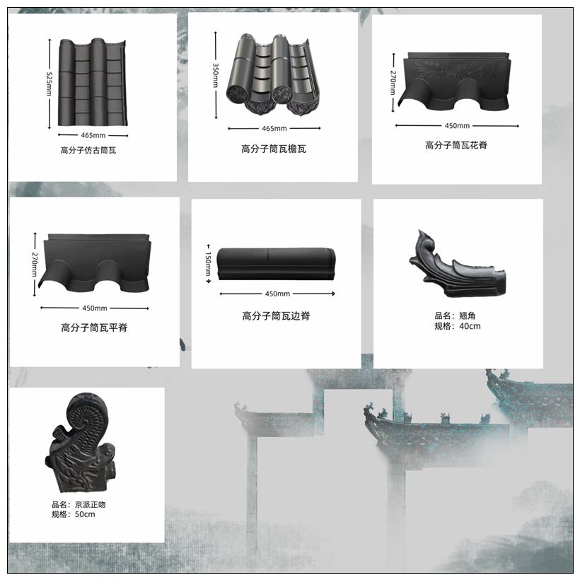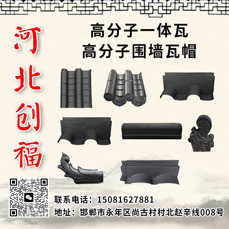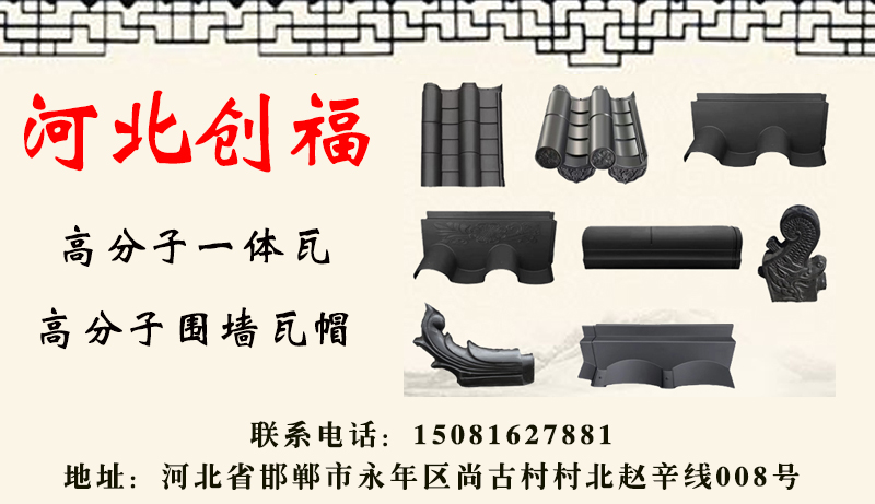 河北创福高分子仿古一体瓦 主营:高分子一体瓦,高分子围墙瓦帽、高分子仿古筒瓦、檐瓦、边脊、平脊、花脊、高分子徽派檐瓦、徽派正吻、高分子徽派小青瓦、高分子徽派后挡板、翘角、高分子徽派主瓦 联系电话:15081627881 地址:河北省邯郸市永年区尚古村村北赵辛线008号