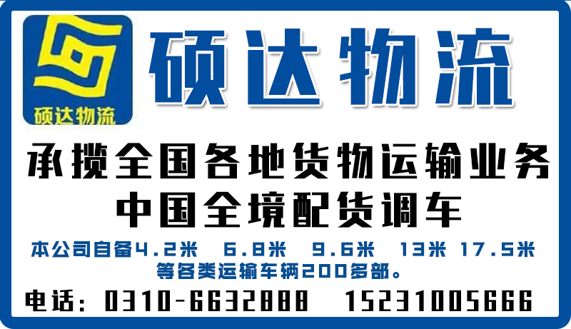 硕达物流 本公司自备4.2米 6.8米 9.6米 13米 17.5米等各类运输车辆200多部。 承揽全国各地货物运输业务,中国全境配货调车, 运价低,服务好,可开发票,可垫运费。 电话:0310-6632888 15231005666 地址:永年河北铺村南 十载光辉,今朝再续。携手硕达,兴业发达