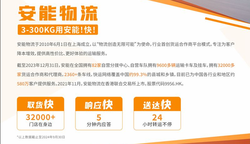 全国38000+门店,乡镇覆盖99.6%,全国无加收,无特殊区域,工厂件,国营公司,国际中转仓,港口,机场等免费送货上门,用安能,运好货。