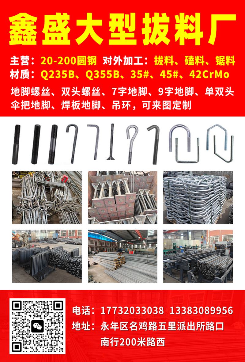 加工生产:地脚螺丝、单双头、双头螺丝 、7字地脚,9字地脚,伞把地脚,焊板地脚,锚板地脚,双头螺栓,单头螺栓,双头丝,单头丝,地脚丝,风力发电螺栓,电力地脚螺栓,钢构地脚螺栓,高强度螺栓,热镀锌螺栓,吊环,异型件,异型勾,全扣丝。丝杠、全扣丝, 电力螺栓, 铁塔螺栓, 高铁热镀锌地脚螺丝、钢结构地脚、 特长高强度地脚螺栓 特长地脚螺栓 高强度地脚螺栓 (8.8级地脚、10.9级地脚、12.9级地脚)地脚螺栓、高强度螺丝, 加长螺栓,双头螺丝等各种异形件