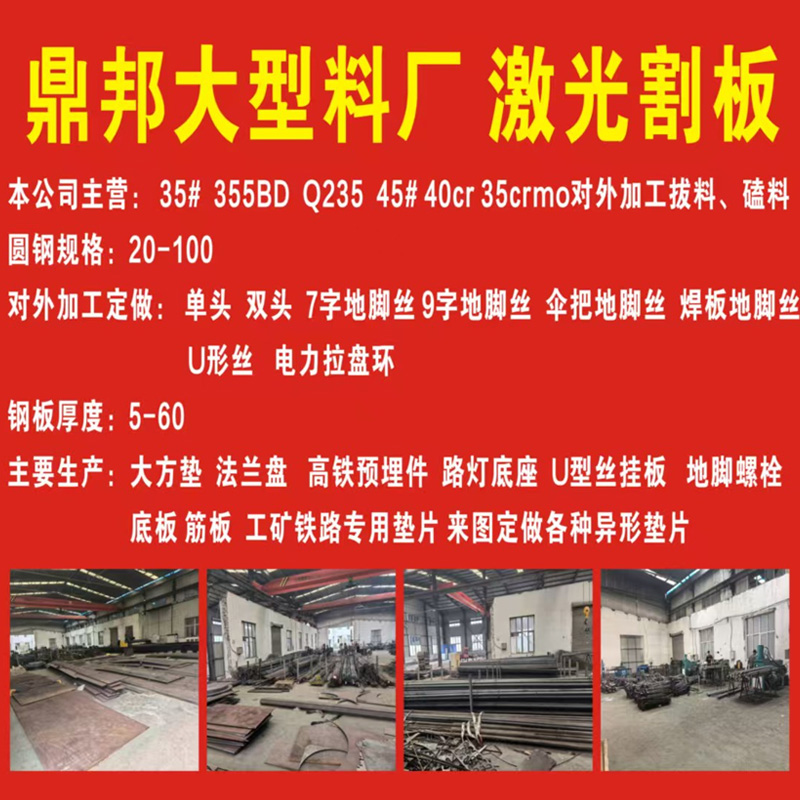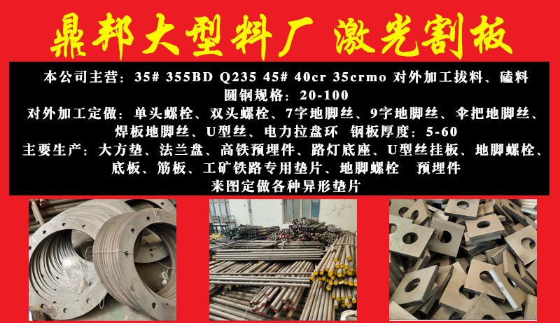 主要生产:大方垫、法兰盘、高铁预埋件、路灯底座、U型丝挂板、地脚螺栓、底板、筋板、工矿铁路专用垫片