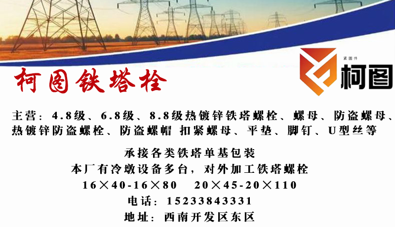 主营:4.8级热镀锌铁塔螺栓、4.8铁塔栓、4.8级铁塔螺栓、6.8级热镀锌铁塔螺栓、6.8铁塔螺栓、6.8级铁塔栓、8.8级铁塔栓、8.8热镀锌铁塔螺丝、8.8铁塔螺栓、热镀锌铁塔栓、热镀锌六角螺母、热镀锌螺帽、热镀锌防盗母、热镀锌防盗螺丝、热镀锌防盗螺帽