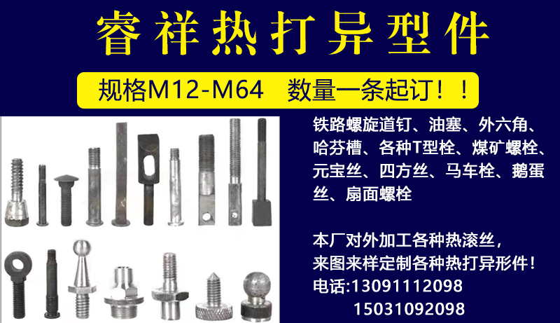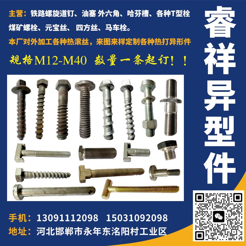 主营产品:铁路螺旋道钉、四方栓、油塞、外六角、哈芬槽、各种T型栓、煤矿螺栓、元宝丝、四方丝、马车栓、