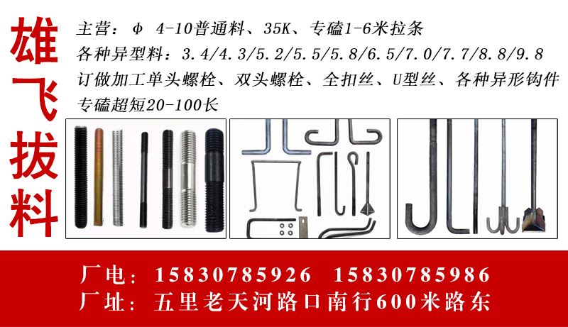 主营:φ 4-10普通料、35K、专磕1-6米拉条 各种异型料:3.4/4.3/5.2/5.5/5.8/6.5/7.0/7.7/8.8/9.8 订做加工单头螺栓、双头螺栓、全扣丝、U型丝、各种异形钩件
