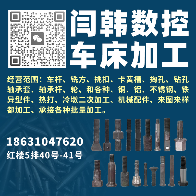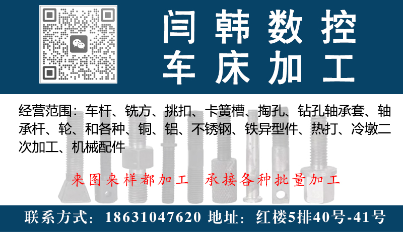 经营范围:车杆、铣方、挑扣、卡簧槽、掏孔、钻孔轴承套、轴承杆、轮、和各种、铜、铝、不锈钢、铁异型件、热打、冷墩二次加工、机械配件